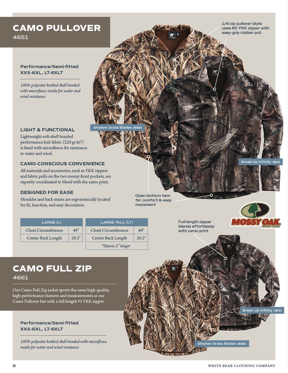 Mossy Oak Camouflage Full Zip Jacker Performance/Semi-fitted XXS-6XL, LT-6XLT 100% Polyester knitted shell bonded with microfleece inside for water and wind resistance LIGHT & FUNCTIONAL Lightweight soft-shell bonded performance knit fabric (220 gr/m2) is lined with microfleece for resistance to water and wind. CAMO-CONSCIOUS CONVENIENCE All materials and accessories, such as YKK zippers and fabric pulls on the two roomy front pockets, are expertly coordinated to blend with the camo print. DESIGNED FOR EASE Shoulder and back seams are ergonomically located for fit, function, and easy decoration. Full zip jacket is available in two camouflage patterns (Mossy Oak Break Up Infinity & Shadow Grass Blades) and Big and Tall sizes - XXS, XS, S, M, L, XL, 2XL, 3XL, 4XL, 5XL, 6XL, LT, XLT, 2XLT, 3XLT, 4XLT, 5XLT, 6XLT . NEVER AN UPCHARGE